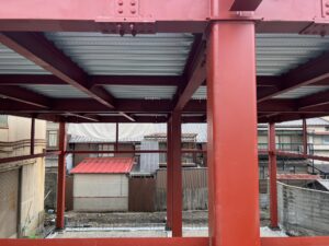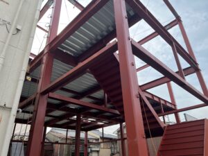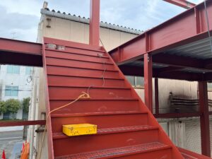 2026.02.25 2階の床組みと階段 倉庫棟の新築工事がだいぶ進みました。 2階部分の床組みと、階段の枠組みが完了しました。 これから2階の床部分にコンクリートを打ち固めて行きます。 1階倉庫の天井部分がかなり高くなるので、自ずと階段も長くなってしまいます。 総務課 一覧へ戻る
